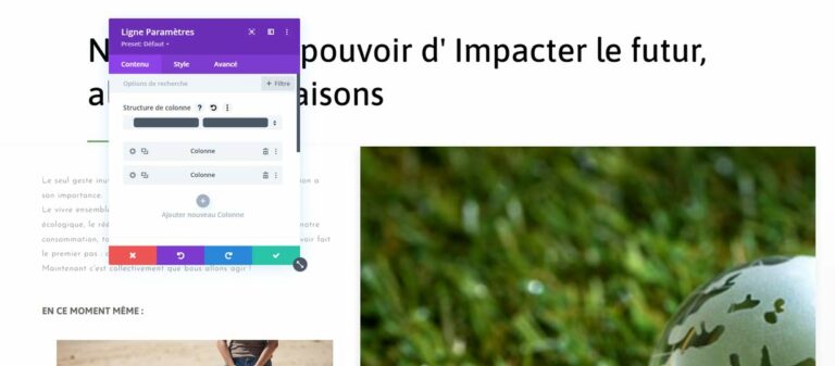 De façon générale le style de chaque module a été établi via la fonction Paramètres soit avec les options embarquées de Divi, soit avec du CSS additionnel.