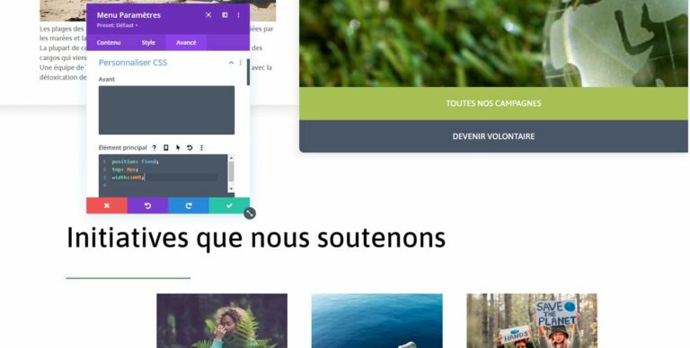 J’ai utilisé le Thème Builder de Divi pour créer une barre de navigation et un footer. J’ai utilisé l’onglet Avancé des Paramètres de la barre de navigation pour insérer du CSS, et rendre sa position fixe.